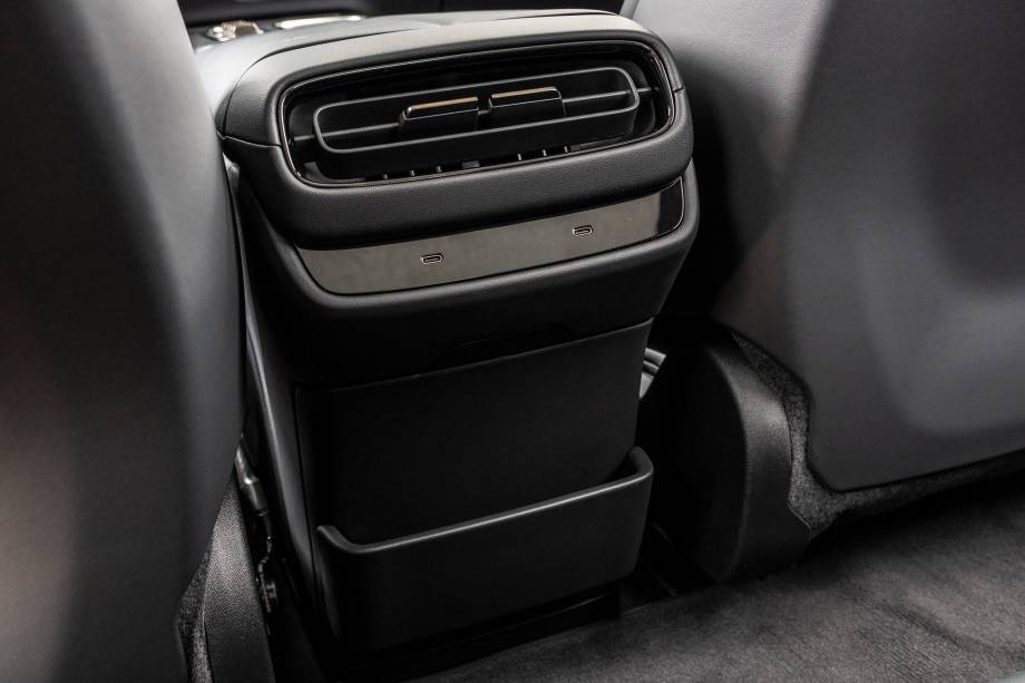 Além disso, é possível instalar acessórios em gavetas no compartimento sob o console, como um aromatizador de cabine ou comprar um par de telas para quem viaja atrás. Isso seria interessante, porque é preciso usar a central para configurar a geladeira (na verdade, a temperatura pode variar entre 2°C e 50°C) que é acessada, justamente, por quem está atrás. Fica camuflada sob a saída de ar traseira (assista no vídeo).