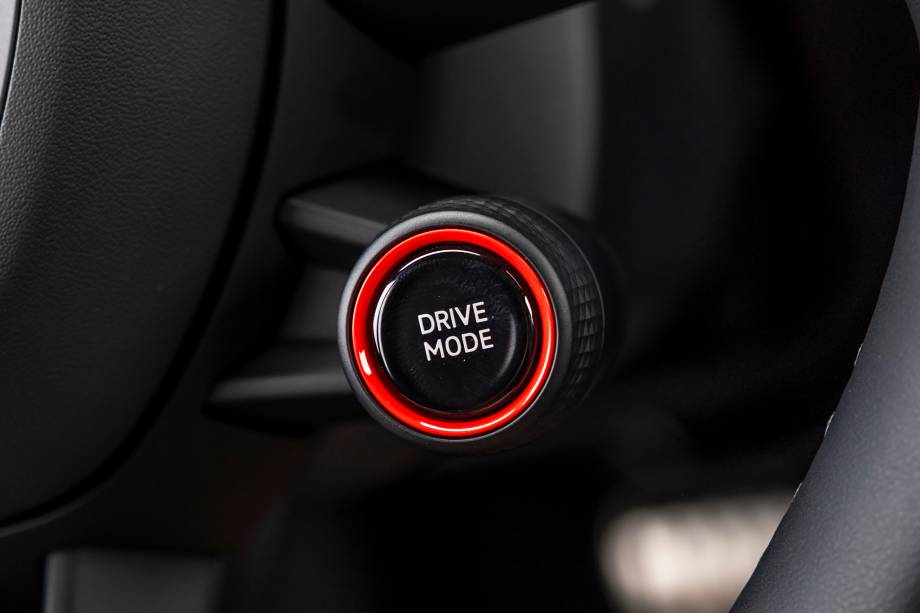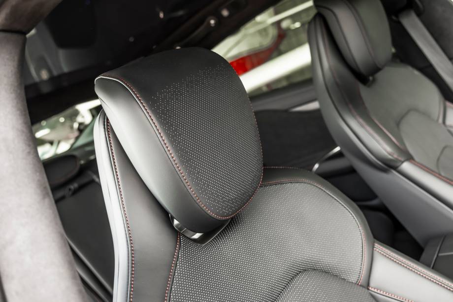 A traseira, sim, tem personalidade. Até existe uma barra de leds integrando as lanternas, mas elas formam um “C” que até lembra um pouco os antigos Aston Martin Vantage. A tampa do porta-malas tem um aplique para dar continuidade ao vidro traseiro (bem como o HB20S faz) e sua parte superior inteira é um aerofólio móvel que pode abrir em até 25°. Sob ele, uma plaqueta metálica identifica os motores.
