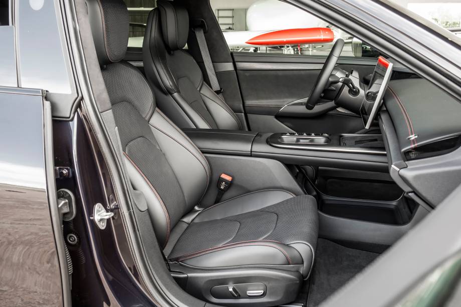 Alguns encaixes poderiam ser mais precisos, mas o carro da Xiaomi usa bons materiais de acabamento, com direito a costuras aparentes e parafusos estilizados no painel. Bancos dianteiros têm ajustes elétricos, aquecimento e ventilação. Bancos traseiros e volante têm apenas aquecimento.