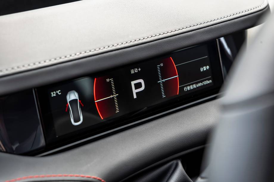 É uma interface rápida e fluida, com diversos comandos de acesso rápido. Mas ainda vai levar uns meses para ter uma opção de língua que não seja o mandarim. Mas o legal é poder comprar acessórios que podem ser acoplados à tela, como botões para o som, barras de led laterais e mostradores redondos customizáveis para o topo da tela. A ideia é usar isso para que o carro possa ser atualizado futuramente.