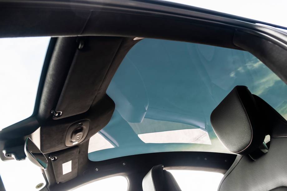 No teto, o ressalto acomoda o LiDAR usado para dar precisão aos sistemas de condução autônoma junto com 12 sensores de ondas milimétricas e mais 11 câmeras, mas o sistema só funciona por completo em algumas cidades chinesas já mapeadas. O teto, aliás, é todo de vidro e bloqueia 99% dos raios UV e 97,6% da luminosidade para não ficar muito quente.