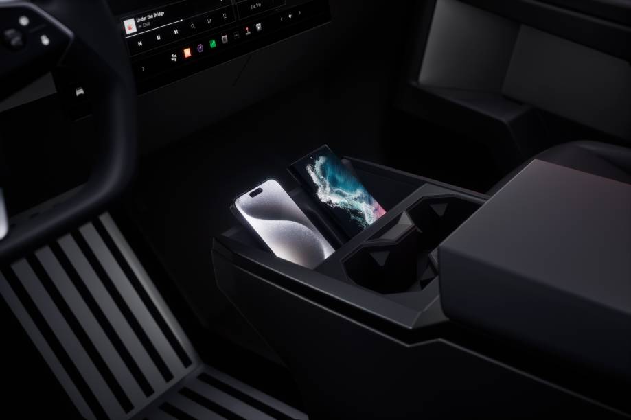 A Cybertruck não é mais aconchegante por dentro. O conceito de funcionamento é típico da Tesla, sem comandos físicos. Eles dispensam até a alavanca de seta e a alavanca seletora de marchas (use a tela, por favor!). Só existem botões no volante, quase todo o resto tem que ser controlado pela tela central de 18,5 polegadas, seja o intervalo do limpador de para-brisa ou a direção das saídas de ar.