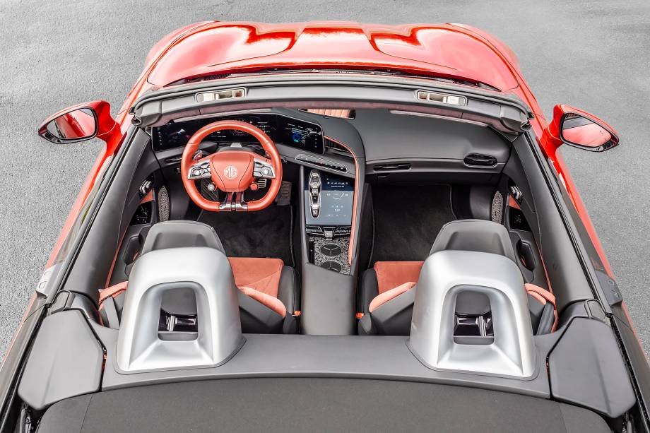O MG Cyberster envolve o motorista com um cockpit que mais parece um centro de operações. Há três telas à frente do motorista: o quadro de instrumentos é maior e vai no meio, enquanto a tela à esquerda exibe navegador, Android Auto ou Apple CarPlay. A tela da direita fica à disposição para mostrar condições de carga ou controles de entretenimento do carro.