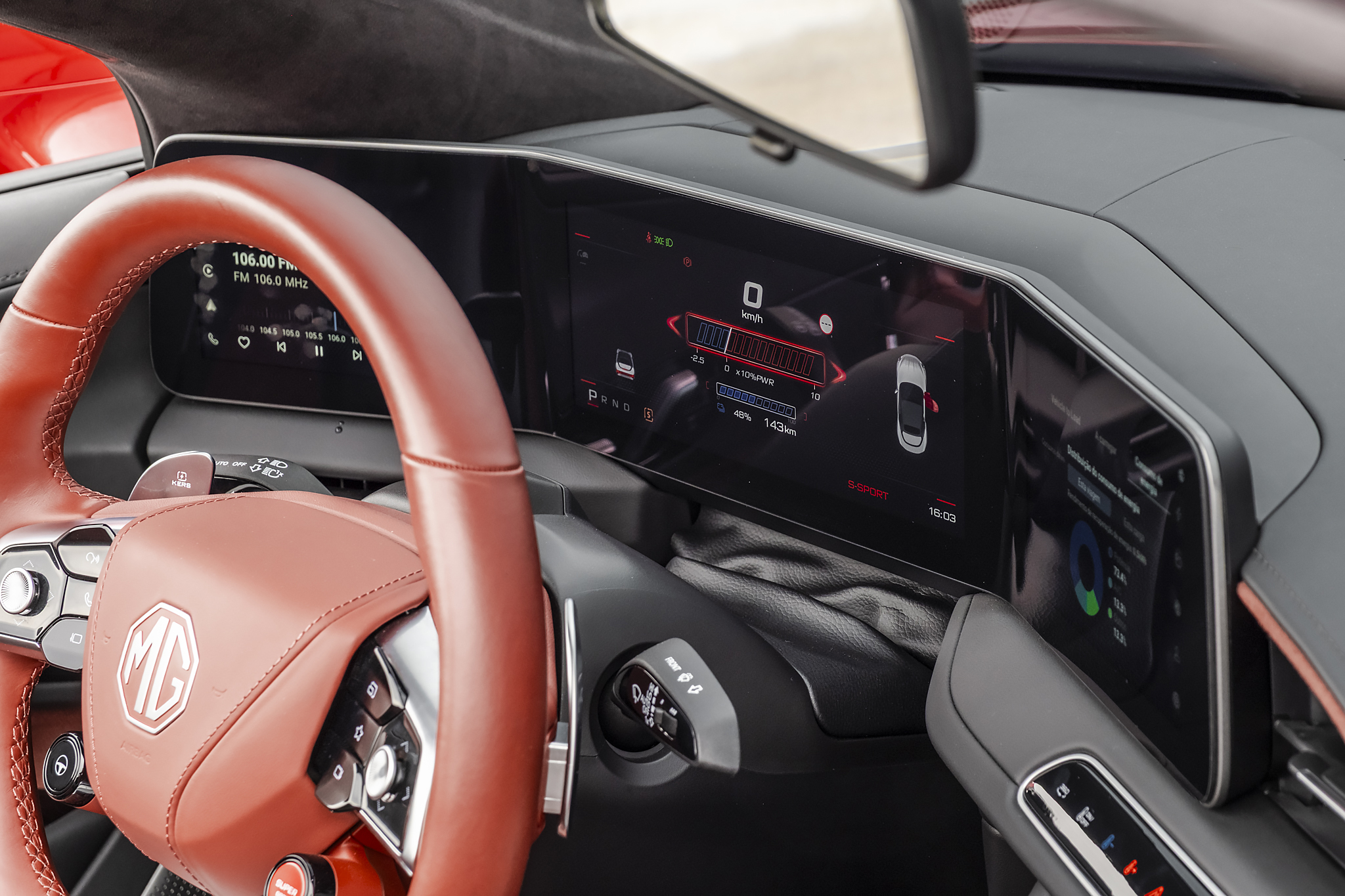 No console central, ao lado dos botões de marcha, há uma tela para operar o ar-condicionado e assistentes de condução. Certas funções, como controle de largada e modos de condução, têm botões individuais no volante. Pode parecer confuso, mas há uma lógica de funcionamento e a interface pareceu mais rápida que a usada nos MG4 e MGS5.