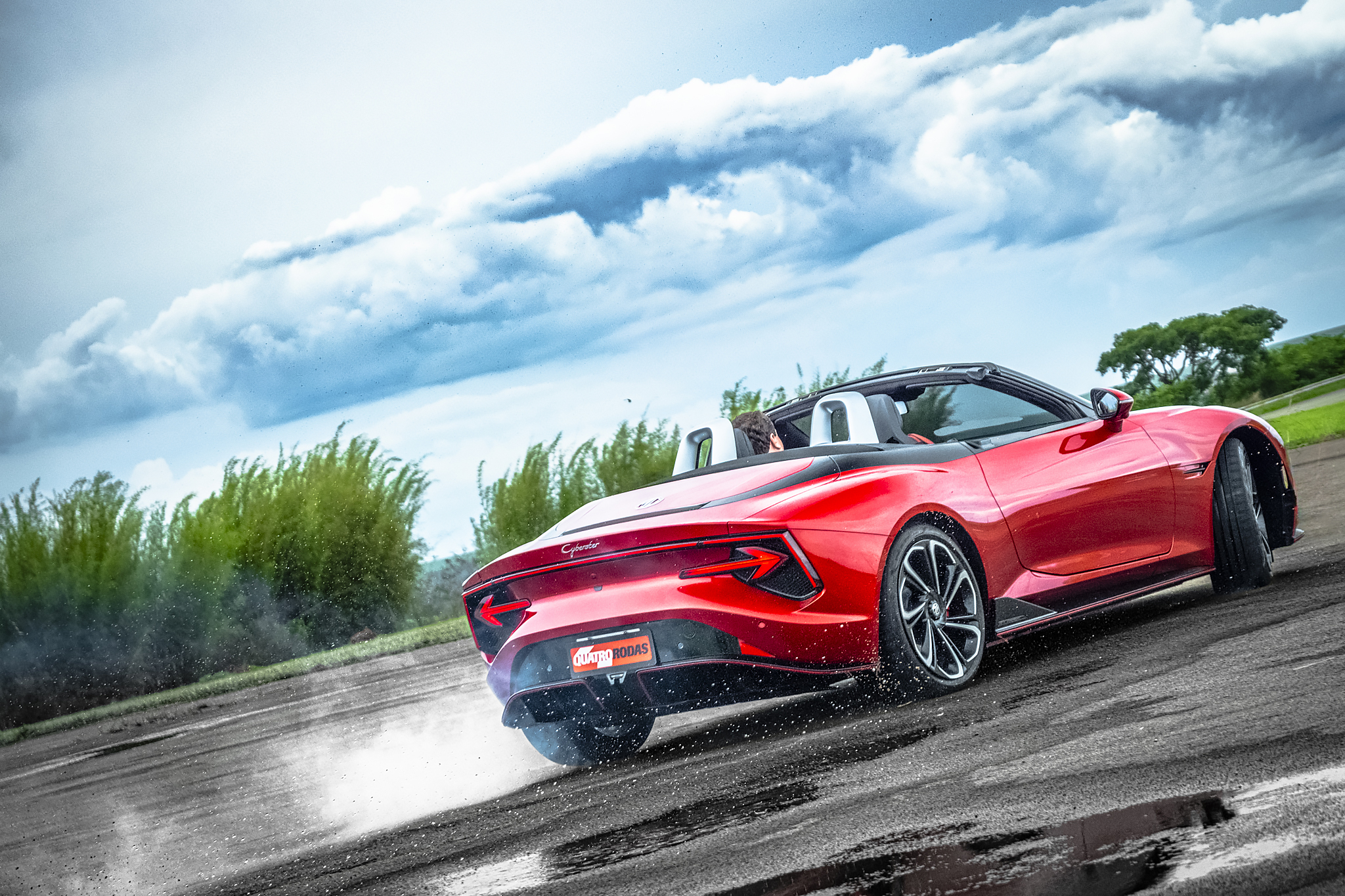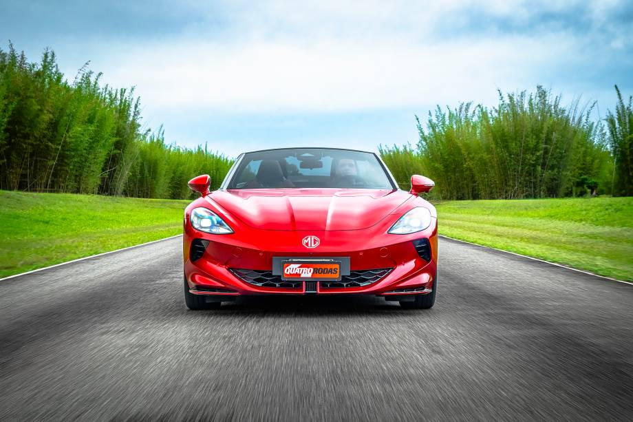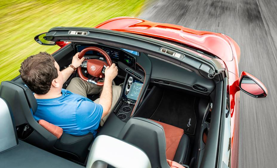 O Cyberster é tão potente quanto um bom carro V8, mas seus 510 cv nascem em dois motores elétricos, um para cada eixo. O aproveitamento dessa potência é impressionante: precisou de meros 3,5 s para chegar aos 100 km/h em nosso teste, quando um BMW M3 com a mesma potência (e, claro, uma carroceria maior) precisou de 3,9 s para cumprir o mesmo ensaio, sendo 270 kg mais leve – o roadster da MG, apesar de esbelto, pesa 2 toneladas (outra característica que Colin Chapman e cia. reprovariam).