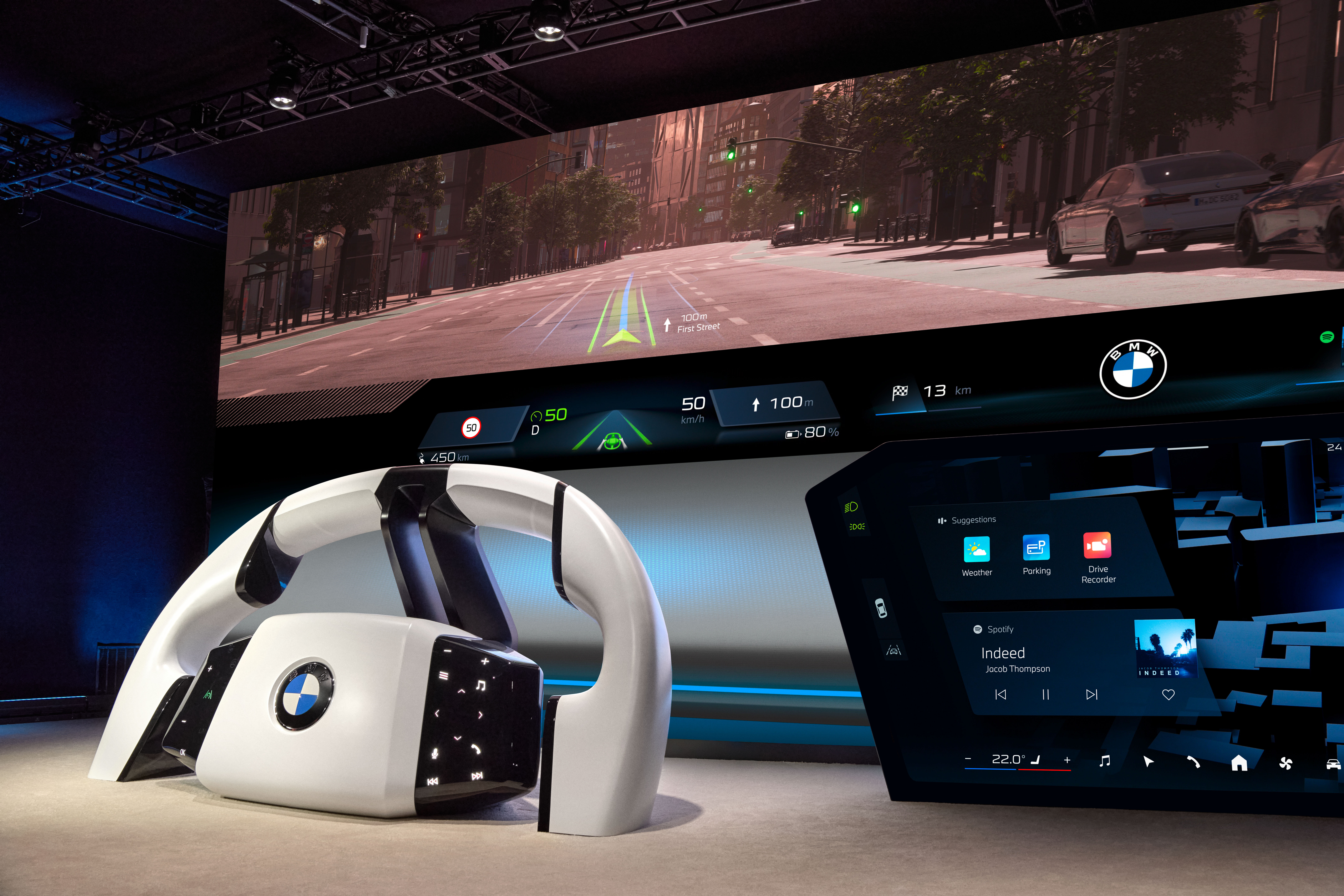 A BMW encolheu todos os jornalistas presentes. Como ilustrar um futuro sem o quadro de instrumentos como conhecemos, a fabricante criou uma versão gigante do novo quadro de instrumentos dos seus carros, usando telas e uma réplica do seu novo volante, bem diferente porque terá apenas raios centrais.