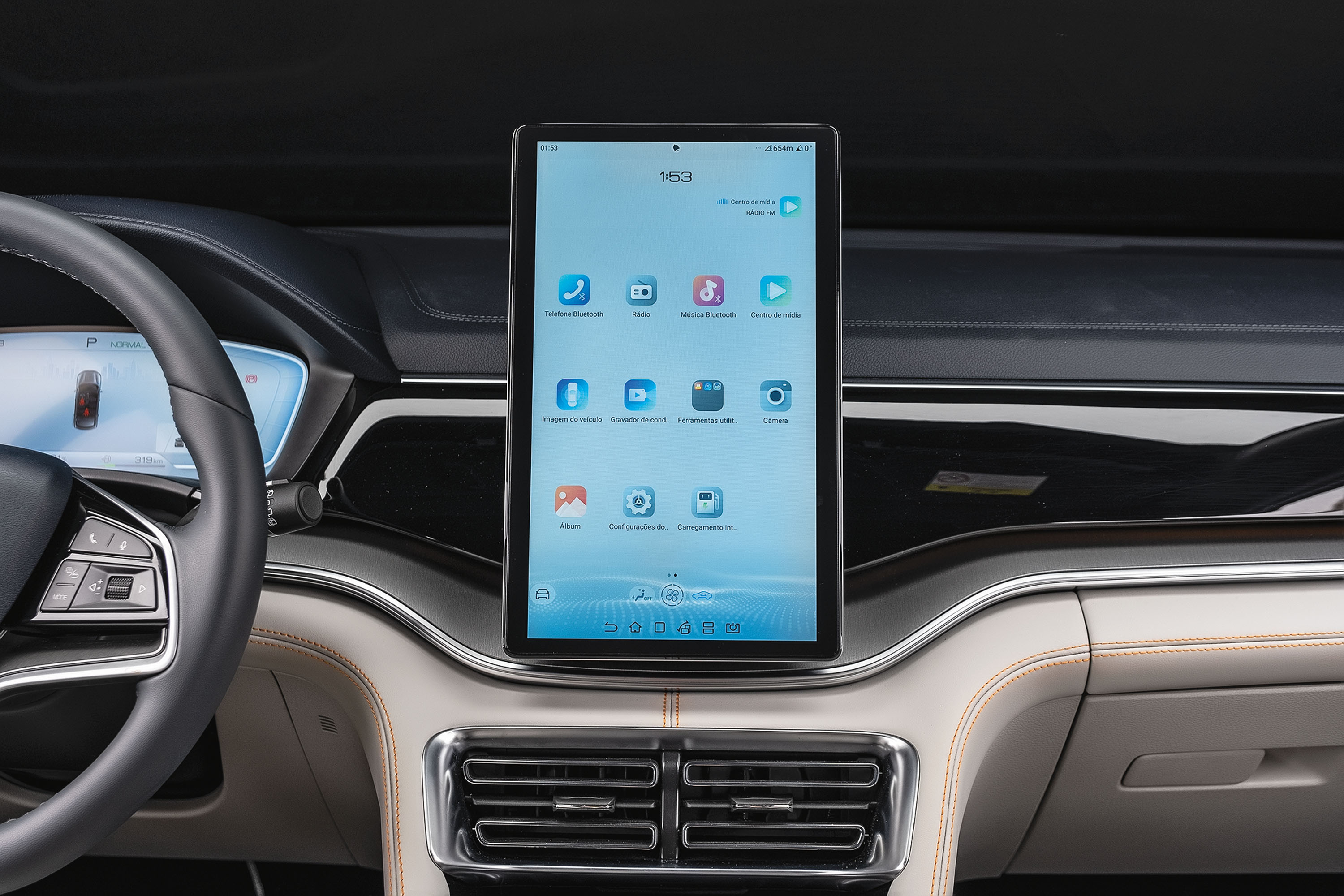 A cabine tem ainda quadro de instrumentos digital e uma curiosa central multimídia giratória com tela de 12,8”. O ponto fraco era o pareamento improvisado da multimídia com Android Auto e Apple CarPlay, por meio de um adaptador.