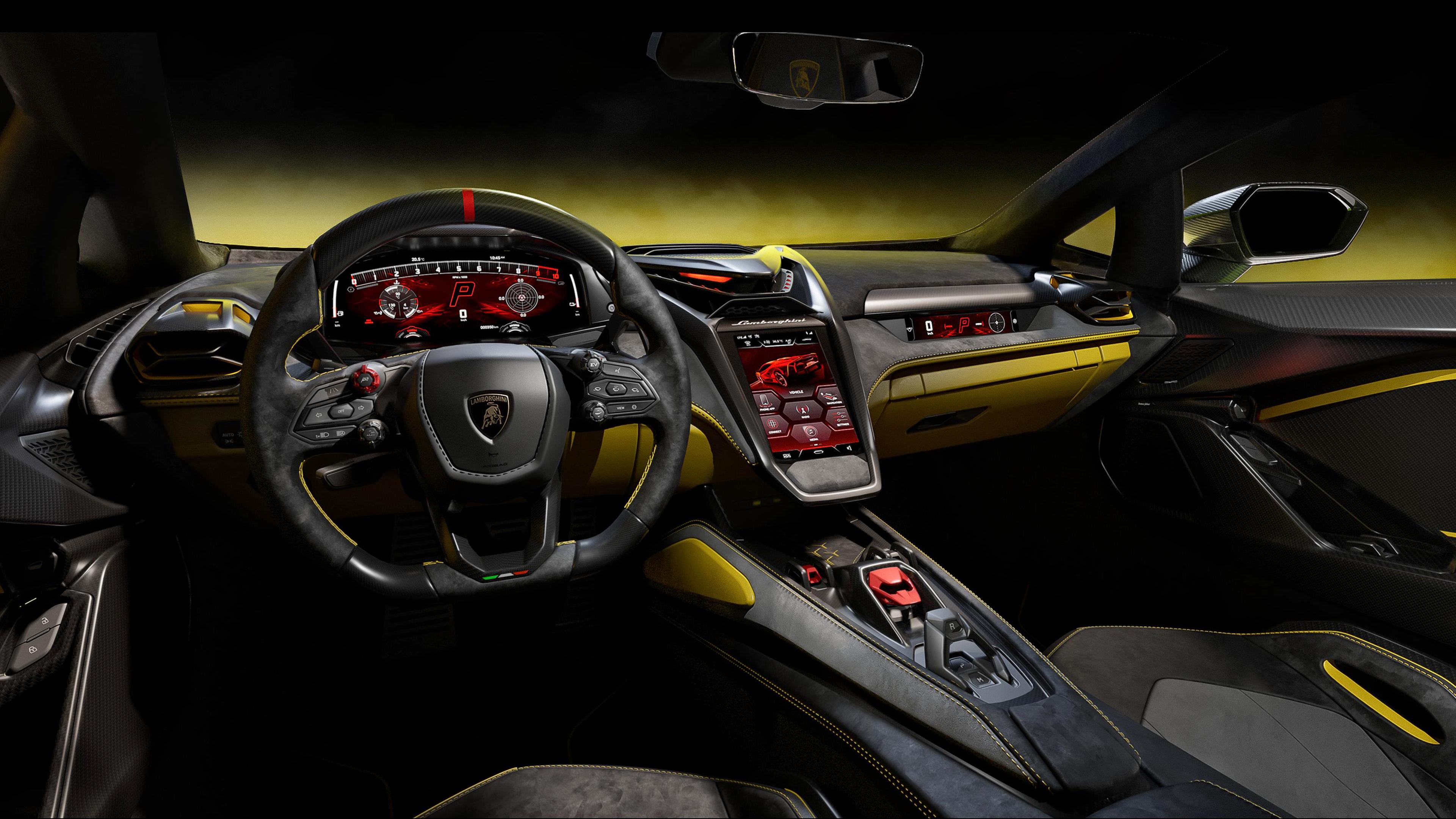O painel do Lamborghini Fenomeno segue a estrutura vista no Revuelto, com direito às mesmas três telas, para quadro de instrumentos, central multimídia e para que o passageiro também tenha acesso às informações de desempenho. No entanto, é totalmente personalizável pelo programa Ad Personam, que permite mudar cores, materiais e texturas das peças ao gosto do cliente.