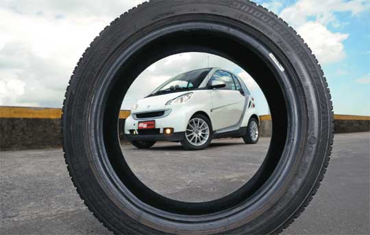 Na revendedora de pneus Colonial Rodas, também de São Paulo, a resposta foi curiosa: “Temos esse pneu, sim. É que alguns Smart vieram aqui colocar rodas maiores. É praticamente novo, já que o ex-dono saiu da concessionária e veio até aqui”, diz o vendedor. E se quisermos um pneu novo? “Não trabalhamos com essa medida.” O susto maior veio quando a loja anunciou o preço praticado no pneu seminovo: “Custa 700 reais”.