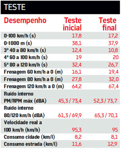 A comparação dos testes inicial e final indica uma piora considerável nos números de frenagem. De 60 a 0 km/h, por exemplo, a distância necessária subiu de 16,1 para 19,4 metros. “No desmonte, vou olhar o sistema de freio com atenção especial, mas creio que a piora esteja mais relacionada aos pneus, que já passaram de meia-vida”, diz Fukuda. Os testes de aceleração, retomada e consumo de combustível apresentam mais melhoras que pioras. Na cidade, o consumo subiu discretamente (de 8,2 para 8,1 km/l de etanol), mas na estrada melhorou substancialmente (de 11,6 para 12,9 km/l).
