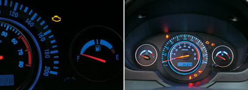 Luz de injeção acesa: ligamos para o 0800 da JAC, mas ninguém atendeu. Não era nada grave (esq.) | Sem regulagem de intensidade, a luminosidade excessiva incomoda em viagens noturnas (dir.)