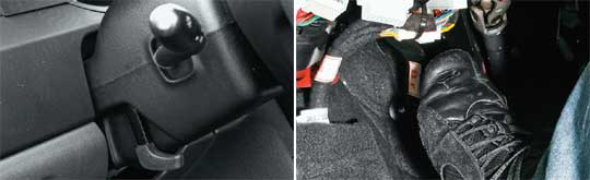 Sistema de regulagem de altura do volante emperrado: quem dirigiu o J3 reclamou dele (esq.); Olhe onde pisa: o pé pode enroscar no chicote elétrico que passa próximo aos pedais (dir.).