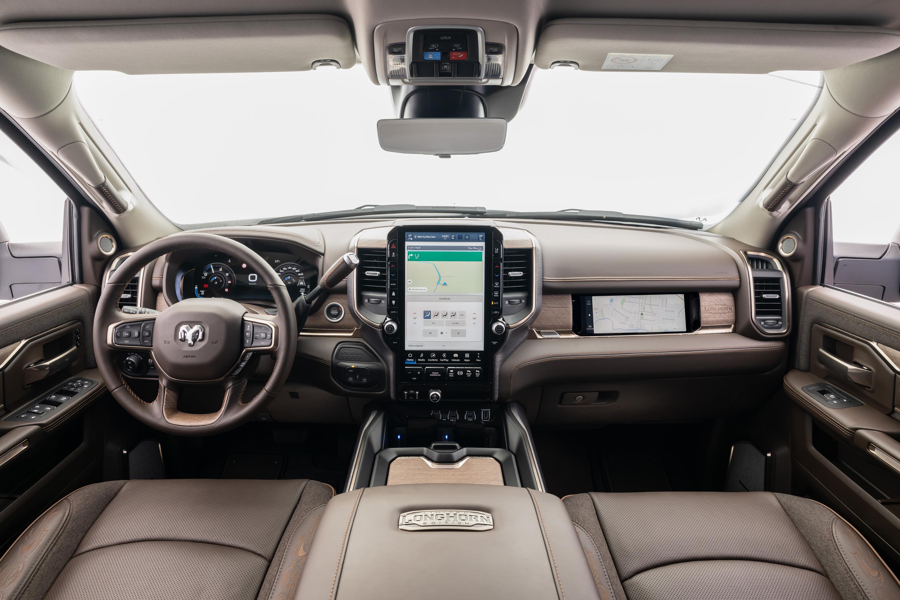 Um caminhão faria isso muito bem, claro, mas não tem o acabamento interno todo de couro e não é feito para entregar tanto conforto aos ocupantes. Na Ram 3500 Longhorn há bancos com ventilação, aquecimento e função de memória para o motorista que contempla também a posição dos espelhos e a regulagem elétrica de distância dos pedais, mas a direção é apenas escamoteável, sem ajuste de profundidade. Os bancos traseiros têm aquecimento e podem ser levantados para transformar o espaço em uma área de carga.